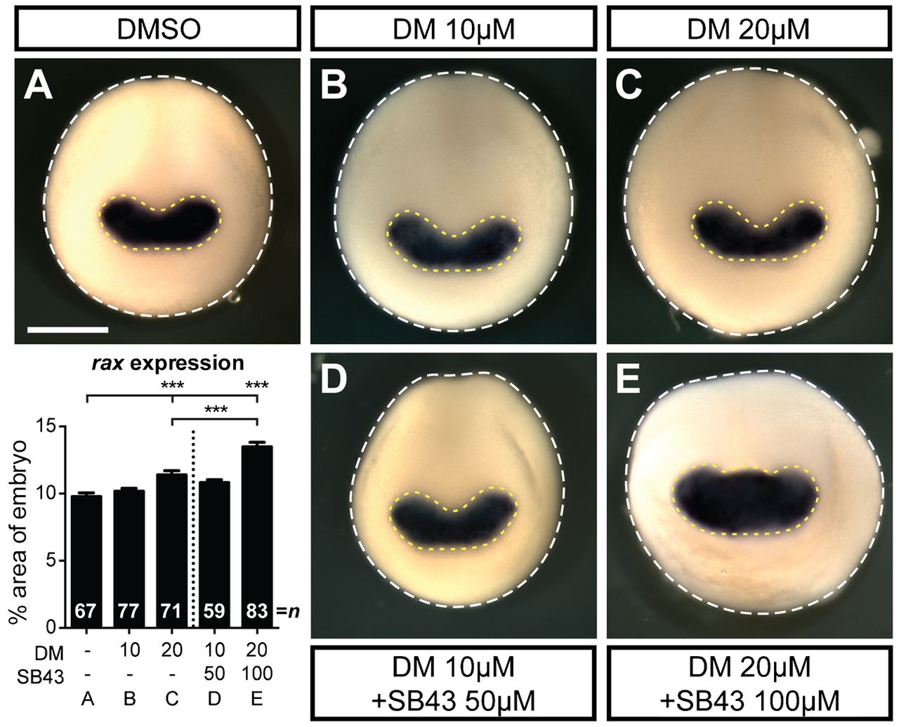 (AâE) In situ hybridization for the eye field marker, rax, in embryos treated with DMSO (A), DM (B,C) or DM+SB43 (D,E) from stage 9â15. Eye field expansion was determined by measuring the area of rax expression (dashed yellow line) normalized to the area of the dorsal face of the embryo (dashed white line), as shown in the graph. Error bars â=â ±s.e.m.; ***p<0.001. Dotted line on graph separates single treatment from dual treatment. Scale bar, 500â