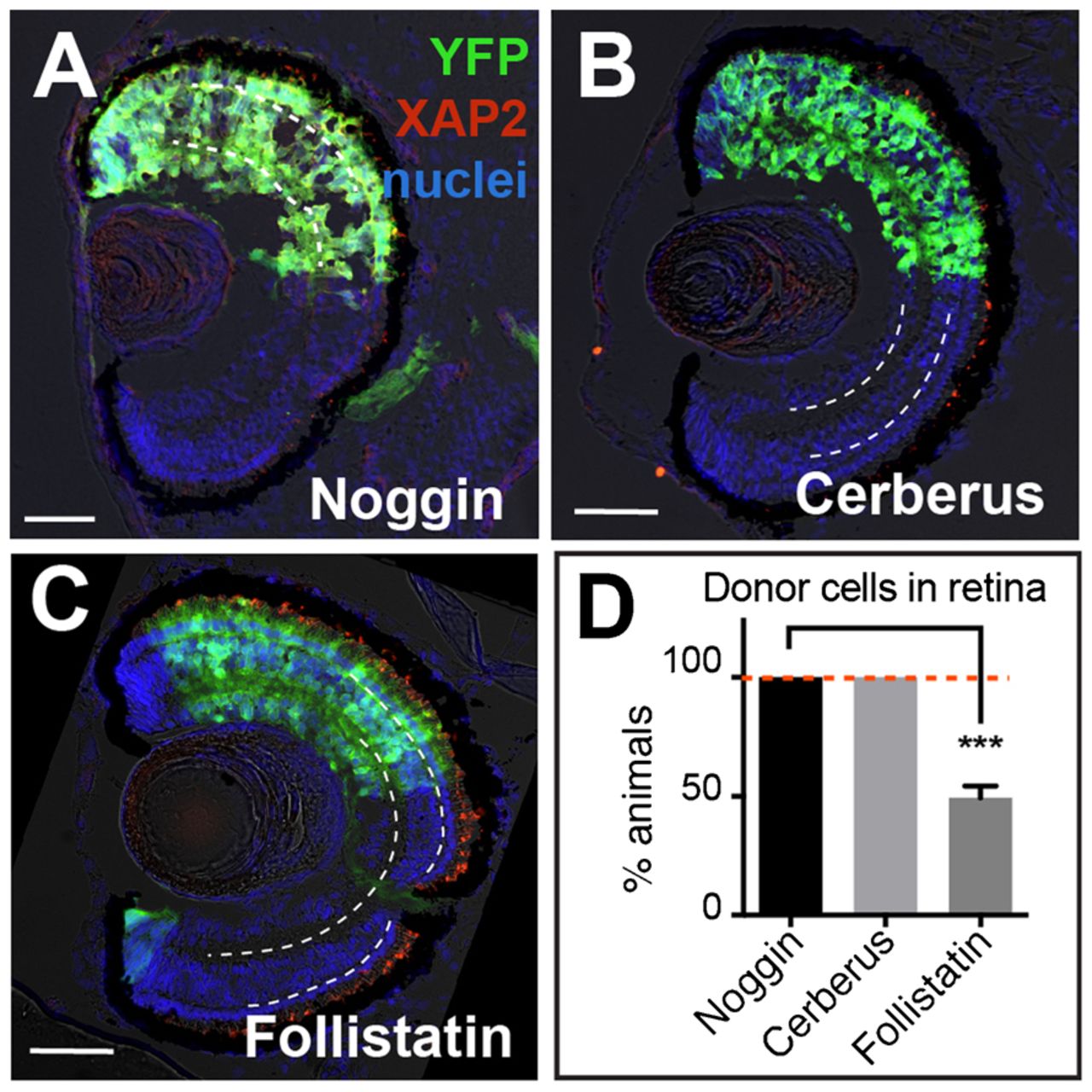 (AâC) YFP+ donor cells expressing Noggin, Cerberus, and Follistatin all contribute to the retina. However, Noggin- and Cerberus-treated cells formed retina in all animals while cells expressing Follistatin had a significantly lower retinal integration efficiency (D). On retinal sections, dashed white lines lie on outer and inner plexiform layers. Green, YFP donor cells; red, rod photoreceptor marker XAP2; blue, DAPI staining. YFP, 500â