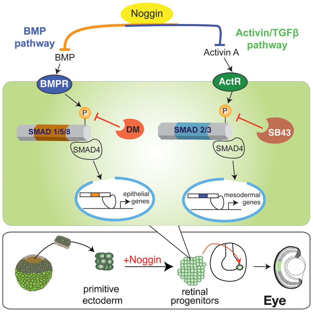 DM and SB43 inhibit activation of Smads by BMP and Activin receptors, respectively. In both pathways, gene transcription fails to drive epithelial or mesoderm specifying genes, which allows primitive ectoderm to take on a retinal progenitor cell fate. |