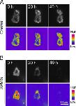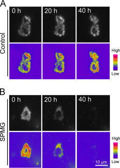 Fig. 2. Time-lapse imaging on the disassembly of aneural AChR clusters induced by MG patient plasma. (A) and (B) A series of time-lapse fluorescence images showing the effects of the SPMG patient plasma on the maintenance of AChR clusters in cultured Xenopus muscle cells. The same AChR clusters were followed over a period of 40 h in the absence (A) or presence (B) of the SPMG patient plasma. To clearly depict the change in fluorescence intensity of AChR, 8-bit pseudo-colored images were showed in the bottom panels for each condition.
