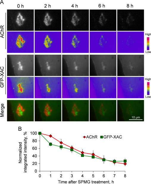 Fig. 5. Spatio-temporal correlation between AChR cluster disassembly and ADF/cofilin localization. (A) A representative series of time-lapse images showing the correlation between the disassembly of aneural AChR clusters and ADF/cofilin localization induced by the SPMG plasma treatment in Xenopus muscle cultures. To clearly depict the change in fluorescence intensity of AChR and GFPâXAC, 8-bit pseudo-colored images were showed in the bottom panels for each marker. The spatial correlation between AChR (red) and GFPâXAC (green) was shown in the merged color images in the bottom row. (B) Quantitative analysis showing the temporal change in the integrated intensity of AChR and GFPâXAC fluorescence signals in response to the SPMG plasma treatment. The respective intensities were normalized with their integrated intensity values at 0 h. N=3. Data are represented as mean±SEM.