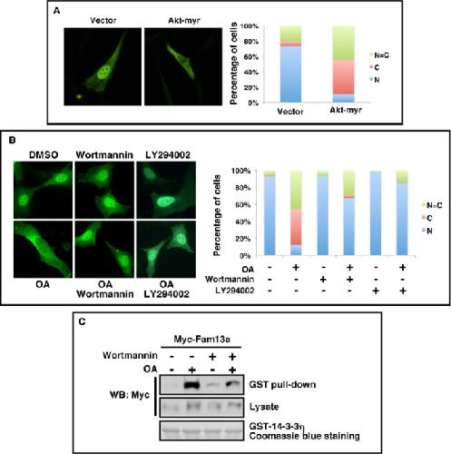 FIGURE 5:. Akt promotes cytoplasmic sequestration of Fam13a and binding between Fam13a and 14-3-3. (A) Representative immunofluorescence images, showing the subcellular distribution of Fam13a when cotransfected with an empty vector or Akt-myr in NIH3T3 cells. (B) Representative immunofluorescence images, showing subcellular localization of Fam13a in NIH3T3 cells treated with DMSO (control), OA, wortmannin, LY294002, OA plus wortmannin, or OA plus LY294002. Fam13a localized in the nucleus in control (DMSO) cells. OA-treated cells exhibited cytoplasmic localization of Fam13a. Fam13a remained in the nucleus in wortmannin, LY294002-, OA/wortmannin-, or OA/LY294002-treated cells. Bar graphs in A and B indicate the percentage of cells that exhibit nuclear, cytoplasmic, or homogeneous subcellular distribution. (C) Inhibition of Akt activation by wortmannin reduces OA-induced binding between Fam13a and 14-3-3 in a GST pull-down assay. Fam13a-expressing NIH3T3 cells were treated with DMSO (control), OA, wortmannin, or OA plus wortmannin. Cell lysates were used in a GST pull-down assay. OA treatment strongly enhanced the binding between Fam13a and GSTâ14-3-3. This effect of OA treatment was reduced by wortmannin treatment. Wortmannin treatment itself had minimal effect on the binding between Fam13a and GST-14-3-3. |