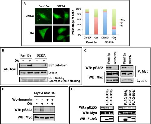 FIGURE 6:. Ser-322 is important for subcellular distribution of Fam13a and its interaction with 14-3-3. (A) Representative immunofluorescence images, showing the subcellular distribution of Fam13a and S322A in NIH3T3 cells treated with DMSO (control) or OA. Bar graph indicates the percentage of cells that exhibit nuclear, cytoplasmic, or homogeneous subcellular distribution. (B) A GST pull down, showing that Ser-322 is important for the binding between Fam13a and 14-3-3 and the effect of OA on this interaction. Fam13a- and S322A-expressing NIH3T3 cells were treated with DMSO (control) or OA. Cell lysates were used in a GST pull-down assay. Interaction between Fam13a and 14-3-3 was markedly enhanced in OA-treated cells. In contrast, S322A mutant showed weaker interaction with 14-3-3 in OA-treated cells. (C) Western blot, showing the specificity of the anti-phosphoS322 (pS322) antibody. Note that the anti-pS322 antibody strongly reacted with Fam13a. It did not react with Δ315–329 but recognized S322A weakly. (D) Western blot, showing Ser-322 phosphorylation in NIH3T3 cells treated with DMSO (control), OA, wortmannin, or OA plus wortmannin. pS322 level was increased by OA treatment. The effect of OA on pS322 was reduced by wortmannin treatment. (E) Western blot, showing that overexpression of B56β, B56γ, B56δ, and B56ε decreased Ser-322 phosphorylation. All B56 expression constructs were FLAG tagged. |