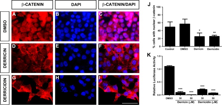 Fig 5. Derricin and derricidin affect β-catenin cell localization and Wnt reporter activity in HCT116 cells.(A-I) β-catenin immunostaining of HCT116 cells treated with 30 μM of each chalcone for 24 h. (A-C) In control conditions, majority of cells show β-catenin staining of nucleus. (D-F) After treatment with derricin, this staining is lost and most cells show β-catenin in cytoplasm and membrane. (G-I) Derricidin treatment also reduces nuclear staining of β-catenin. (J) Quantification of immunostaining showed that both chalcones reduce nuclear β-catenin. (K) Wnt/βâcatenin specific reporter assay of TOPFlash/Renilla transfected HCT116 cells. Both chalcones reduce Wnt reporter activity after 30 and 50 μM treatment for 24 h. Scale bar: 50 μM, *p<0.05,**p<0.01, ***p<0.001. |