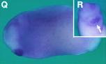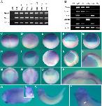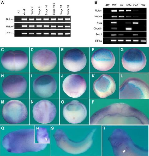 Figure 4. Notum Expression Patterns during Xenopus Embryogenesis (A and B) RT-PCR revealed that Notum is maternally and zygotically expressed throughout Xenopus embryogenesis (A), and is enriched animally and dorsally at stage 10.5; animal caps, AC; dorsal marginal zone, DMZ; ventral marginal zone, VMZ; vegetal caps, VC; a pan-mesodermal marker, Xbra; a dorsal marker, Chordin; an animal and ventral marker, Msx1. (CâT) Whole mount in situ hybridization for Notum/Notumâ expression, showing lateral view at 4-cell and stage 6.5 (C and D); lateral and bisected view at stage 8.5 (E and F); bisected view at stage 9.5 (G); lateral and bisected view at stage 10.5, with dorsal on right (H and I); dorsal and bisected view at the stage 11 (J and K); with an enlarged anterior view showing stronger expression anteriorly (L); dorso-anterior (M); dorsal (N, anterior on top); and cross-section (O, dorsal on top; and P, an enlarged view) at stage 15; lateral view at the tail bud stage (Q); with an enlarged anterior view indicating expression in the cement gland (R, arrow); lateral view at the early tadpole stage (S); and with an enlarged view indicating expression in the pronephros region (T, arrowhead). The blue color at the blastocoel surface in bisections was non-specific. See also Figure S3. |