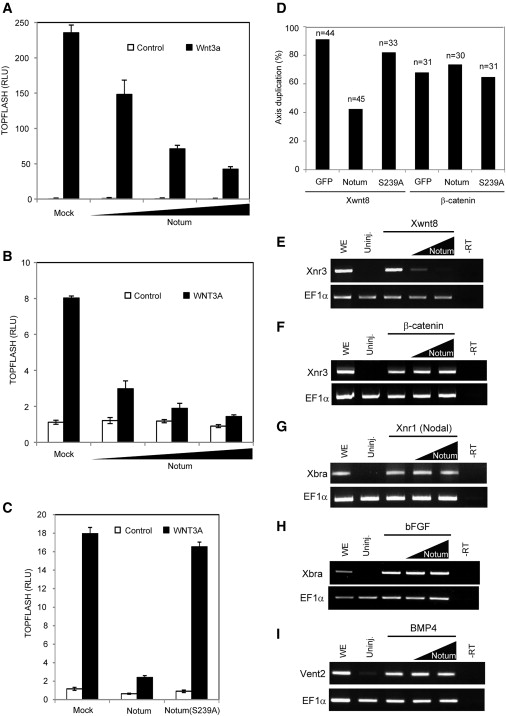 Figure 1. Notum Antagonizes Wnt Signaling in Mammalian Cells and Xenopus Embryos (A) Notum inhibited TOPFLASH induced by Wnt3a in HEK293T cells. Increasing doses of a Notum expression vector were co-transfected with an expression vector for Wnt3a. (B) Notum inhibited TOPFLASH induced by the recombinant WNT3A protein. HEK293T cells transfected with increasing doses of the Notum expression vector were incubated with the WNT3A protein. (C) Notum(S239A) lacked the ability to inhibit TOPFLASH induced by the WNT3A protein. (D) Notum inhibited axis duplication induced by Xenopus Wnt8, but not β-catenin, while Notum(S239A) did not inhibit axis duplication induced by either Wnt8 or β-catenin. n, embryos examined. (EâI) Notum in animal pole explants inhibited expression of Xnr3 induced by Wnt8 (E), but not by β-catenin (F), nor did it inhibit Xbra expression induced by Nodal/Xnr1 (G), or bFGF (H), or Vent2 expression induced by BMP4 (I). EF1α, a loading control; uninjected embryos, uninj.; whole embryos, WE; whole embryos without the reverse transcriptase, -RT. There were two doses of Notum mRNA that were injected. Error bars (AâC) represent SD of triplicated experiments. See also Figure S1. |
