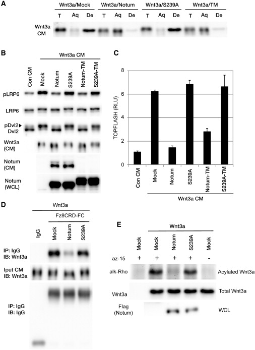 Figure 2. Notum Causes Wnt Deacylation and Inactivation (A) The Wnt3a protein modified by Notum became hydrophilic in the Triton X-114 detergent-aqueous phase separation assay. Wnt3a from mock or Notum(S239A)-expressing cells was hydrophobic and partitioned in the detergent (De) phase, but Wnt3a from Notum- or Notum-TM-expressing cells partitioned in the aqueous (Aq) phase; total input, T. (B) Wnt3a CM from Notum- or Notum-TM-expressing cells was inactive and induced minimal phosphorylation of LRP6 and Dvl2 in mouse embryonic fibroblast cells, whereas Wnt3a CM from mock, Notum(S239A)-, or Notum(S239A)-TM-expressing cells induced phosphorylation of LRP6 and Dvl2. Note that Wnt3a from Notum- or Notum-TM-expressing cells exhibited slightly faster migration. WCL, whole cell lysates. (C) Wnt3a CM from Notum or Notum-TM-expressing cells induced minimal TOPFLASH in HEK293T cells, whereas Wnt3a CM from mock, Notum(S239A)-, or Notum(S239A)-TM-expressing cells induced TOPFLASH. Error bars represent SD of triplicated experiments. (D) Wnt3a secreted from Notum-expressing cells exhibited minimal binding to mFz8CRD-IgG, whereas Wnt3a secreted from mock or Notum(S239A)-expressing cells exhibited binding. (E) Notum, but not Notum(S239A), reduced Wnt3a acylation when they were co-expressed in HEK293T cells. See also Figure S2. |