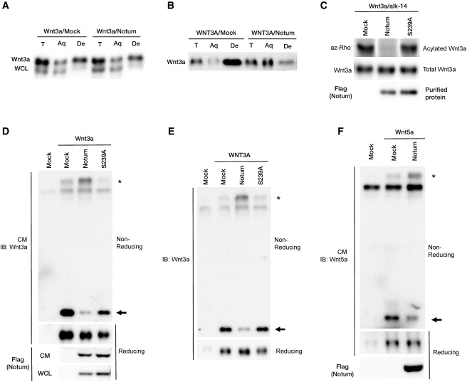 Figure 3. Notum Is Likely a Wnt Deacylase Acting Extracellularly and Causes Wnt3a and Wnt5a to Form Oxidized Oligomers (A) Notum had minimal effects on hydrophobicity of Wnt3a from WCL in the detergent-aqueous phase separation assay. (B) Recombinant WNT3A proteins lost hydrophobicity after incubation with Notum-expressing cells. (C) Notum reduced Wnt3a acylation in vitro. Purified metabolically labeled Wnt3a protein was incubated with mock, purified Notum, or Notum(S239A) proteins. (D) Wnt3a secreted from Notum-, but not Notum(S239A)-, expressing cells formed oxidized oligomer. Wnt3a CM from mock, Notum-, or Notum(S239A)-expressing cells was analyzed by non-reducing or reducing SDS-PAGE. Wnt3a monomers and oxidized oligomers were labeled by an arrow and asterisk, respectively. (E) Recombinant WNT3A proteins formed oxidized oligomers upon incubation with Notum-, but not mock or Notum(S239A)-,expressing cells. (F) Wnt5a proteins secreted from Notum-expressing cells formed oxidized oligomers. See also Figure S2. |