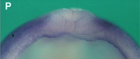 notum (notum, palmitoleoyl-protein carboxylesterase) gene expression in bisected Xenopus laevis/ tropicalis embryo, mid-sagittal section, assayed via in situ hybridization, NF stage 10.5, dorsal left, animal pole up. note: The light blue staining of the blastocoel surface in is non- specific. |