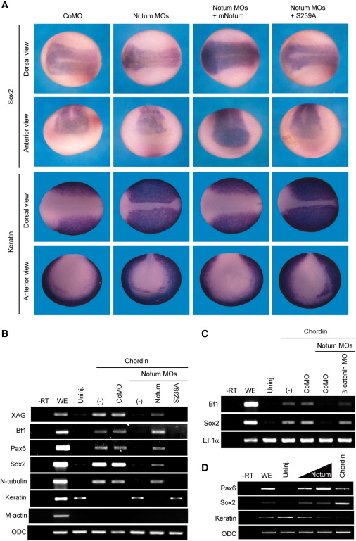 Figure 6. Notum Is Required for Neural Induction in Embryos and Animal Explants (A) The Notum MOs reduced the expression domain of Sox2, a pan-neural marker, and expanded the expression domain of cytokeratin, an epidermal marker, and the reciprocal changes were rescued by mNotum, but not mNutum(S239A), mRNA. See also Table S4. (B) The Notum MOs suppressed expression of neural markers induced by injection of the Chordin mRNA and restored cytokeratin expression that were inhibited by Chordin. The effect of Notum MOs was rescued by mNotum, but not mNotum(S239A), mRNA; a cement gland marker, XAG; anterior neural markers, Bf1 and Pax6; a pan-neural marker, Sox2; a neuronal marker, N-tubulin; an epidermal marker, Keratin; a mesodermal marker, M-Actin; and a loading control, ODC. (C) Chordin induced Bf1 and Sox2 expression when the Notum MOs and a β-catenin MO were co-injected. (D) Injection of Notum mRNA, like that of Chordin mRNA, induced expression of neural markers Sox2 and Pax6 and suppressed that of an epidermal marker, cytokeratin, in animal cap explants. See also Figure S6. |
