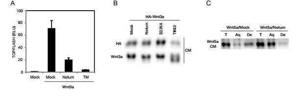 Figure S2. Characterization of Notum-TM, comparison of Notum and Tiki2, and the effect of Notum on Wnt5a. Related to Figures 2 and 3. This figure provides additional data to support Figure 2 and 3. Appears after Figure 2. (A) Expression of either Notum-TM or Notum inhibited Wnt3a-induced TOPFLASH. Error bars represent SD of triplicated experiments. Notum-TM was more potent than Notum in this assay, while the converse was observed in Figure 2C. These differences were reproducible, and might be explained by differences of the two experimental conditions. Under the condition of this figure Notum-TM was tethered to and concentrated on the cell surface, possibly making it more effective in inactivating Wnt3a near the plasma membrane (where signaling occurs) than Notum, which was diffusible in the CM. On the other hand, under the condition of Figure 2C, Wnt3a CM taken from Notum-expressing cells contained Notum, which likely continued to exert its action after the Wnt3a CM was harvested and applied to responding cells for the duration of the TOPFLASH assay. However Wnt3a CM taken from Notum-TM-expressing cells did not contain Notum (i.e.,Notum-TM), and inactivation of Wnt3a ceased when the CM was harvested, potentially explaining the difference. (B) Notum did not cleave the amino terminal HA tag of HA-Wnt3a, while TIKI2 did. Note that Wnt3a mobility alteration by Notum was much more subtle than that by Tiki2. (C) Coexpression of Wnt5a and Notum resulted in loss of hydrophobicity of the secreted Wnt5a protein, as shown by the Triton X-114 detergent-aqueous phase separation assay, suggesting that Wnt5a is a Notum substrate. |