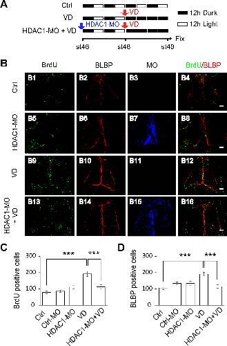 (A). A cartoon showing that stage 46 tadpoles were placed in a 12h/12h dark light incubator for control, or put into a dark box after 48 hours for VD, or electroporated with HDAC1-MO and placed in a dark box after 48 hours for HDAC1-MO+VD. Tadpoles were incubated with BrdU for immunostaining at stage 49. (B) Fluorescent images showing representative BrdU- and BLBP-labeled cells in control (B1-B4), HDAC1-MO (B5-B8), VD (B9-B12) and HDAC1-MO+VD (B13-B16) tadpoles. Scale: 50 μm. (C-D). Quantification data revealed that visual deprivation increases the number of BrdU- (C) and BLBP-labeled cells (D) and HDAC1-MO knockdown blocked VD-induced increase of proliferative cells. (BrdU: Ctrl, 78.0 ± 8.3, N = 5, Ctrl-MO, 85.4 ± 7.1, N = 5, HDAC1-MO, 109.5 ± 9.8, N = 6, VD, 191.8 ± 16.4, N = 4, HDAC1-MO+VD, 111.6 ± 13.5, N = 5; BLBP: Ctrl, 105.2 ± 9.2, N = 5, Ctrl-MO, 132.6 ± 9.7, N = 5, HDAC1-MO, 133.0 ± 13.5, N = 6, VD, 191.7 ± 9.9, N = 4, HDAC1-MO+VD, 114.0 ± 10.1, N = 5; ***p<0.001).
