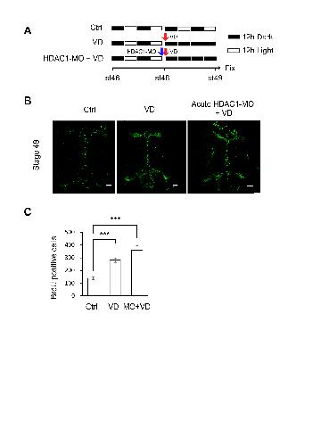 (A). A cartoon showing that stage 46 tadpoles were placed in a 12h/12h dark/light incubator for 96 hrs (Ctrl), or put into a dark box for 48 hrs after 2 days of dark/light cycle (VD), or electroporated with HDAC1-MO and immediately placed in a dark box for 48 hrs after 2 days of dark/light cycle (acute HDAC1-MO+VD). Tadpoles were incubated with BrdU for immunostaining at stage 49. (B) Fluorescent images showing representative BrdU-labeled cells in control (left panel), VD (middle panel) and acute HDAC1-MO+VD (right panel) tadpoles. Scale: 50 μm. (C). Quantification data showed that visual deprivation increases the number of BrdU-labeled cells but acute HDAC1-MO transfection and VD does not change the total number of proliferative cells compared to VD-exposed tadpoles. N = 4, 6, 5, for Ctrl, VD and HDAC1-MO+VD, respectively, ***p<0.001.