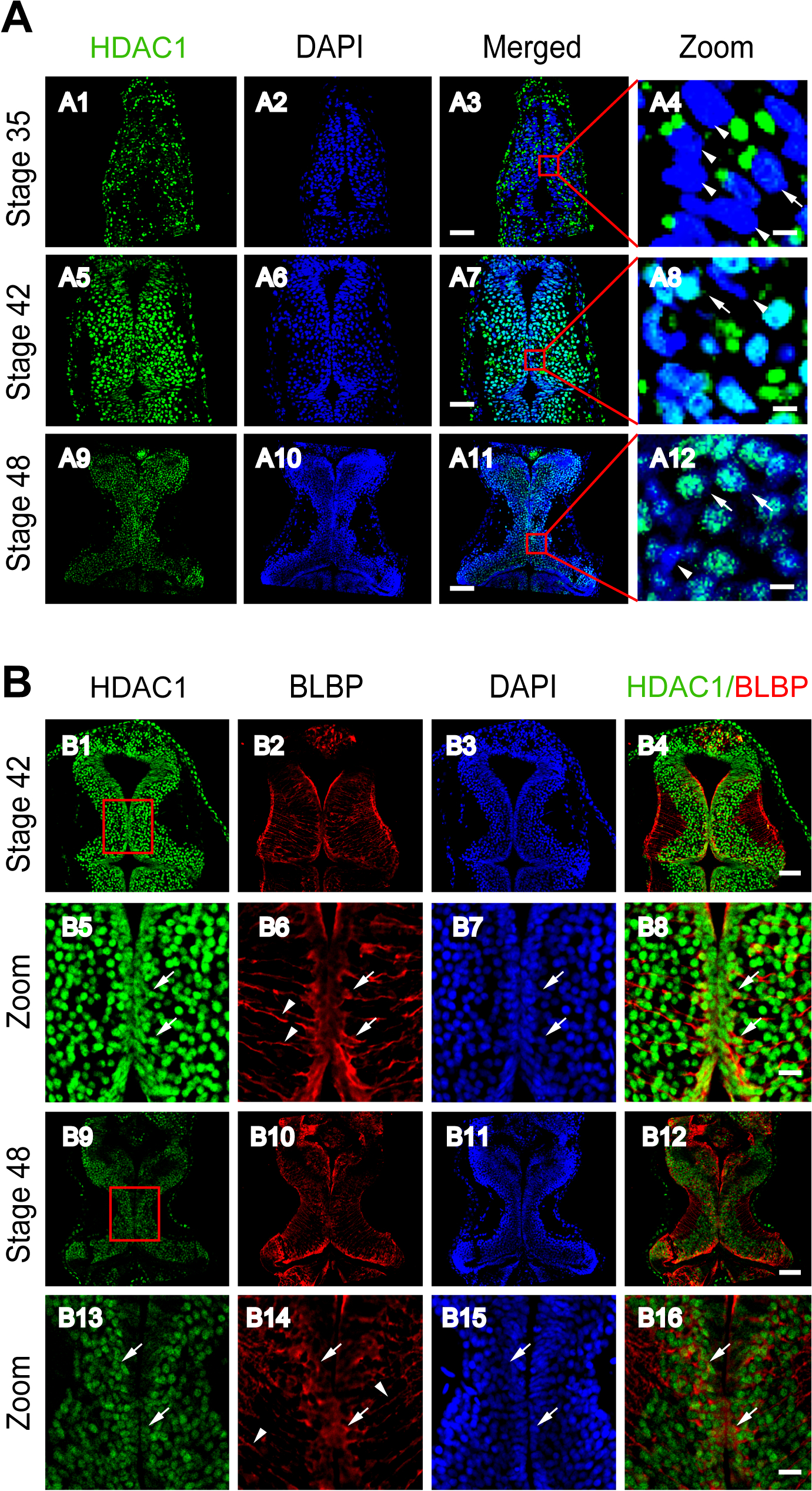 (A). Representative immunofluorescent images showing HDAC1 staining in cells of the developing tectum at stages 35 (A1–A4), 42 (A5–A8) and 48 (A9–A12), respectively. Scale: 50 μm. Zoomed in images are demarked by red lines and are shown to the right of each original figure (A4, A8, A12). Scale: 5 μm. Arrow heads indicate cell nuclei stained for DAPI alone, whereas arrows indicate nuclei that also contain HDAC1. (B). Representative immunofluorescent images showing colocalization of HDAC1 and BLBP staining at stages 42 (B1–B4, zoom in: B5–B8), and 48 (B9–B12, zoom in: B13–B16), respectively. Arrow heads indicate the processes of BLBP-stained RGs. Arrows indicate BLBP-staining RGs contain HDAC1. Scale: 50 μm (zoom in: 10 μm).