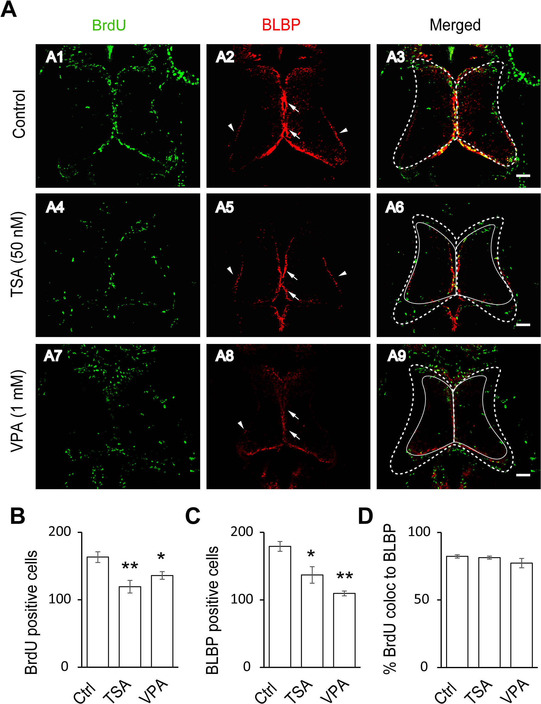 (A). Representative co-staining images showing the BrdU- and BLBP-positive cells in control (A1–A3), TSA-treated (50 nM, A4–A6) and VPA-treated (1 mM, A7–A9) tecta. The BLBP-positive cell bodies reside along the midline of the ventricular layer of the tectum (arrows) with endfeet on the edge of neuropil (arrow heads). The control tectum was outlined with a white dotted line (A3), which was put on TSA- (A6) or VPA-treated (A9) tectum. The TSA- (A6) or VPA-treated (A9) tectum was outlined with a solid line, which is smaller than control tectum (A3). Scale: 50 μm. (B-C) Quantification data showing that the number of BrdU- and BLBP-positive cells were significantly decreased in TSA- or VPA-treated tecta compared to the control. (BrdU: Ctrl, 163.2 ± 7.9, N = 5, TSA, 119.4 ± 9.3, N = 5, VPA, 136.0 ± 5.7, N = 3; BLBP: Ctrl, 179.2 ± 7.2, N = 5, TSA, 137.0 ± 12.2, N = 5, VPA, 109.7 ± 3.5, N = 3; *p<0.05, **p<0.01). (D). Most of BrdU-labeling cells are colocalized to BLBP-positive cells (Control: 82.3% ± 1.2%, N = 5, TSA: 81.4% ± 1.1%, N = 3, VPA: 77.3% ± 3.4%, N = 3).