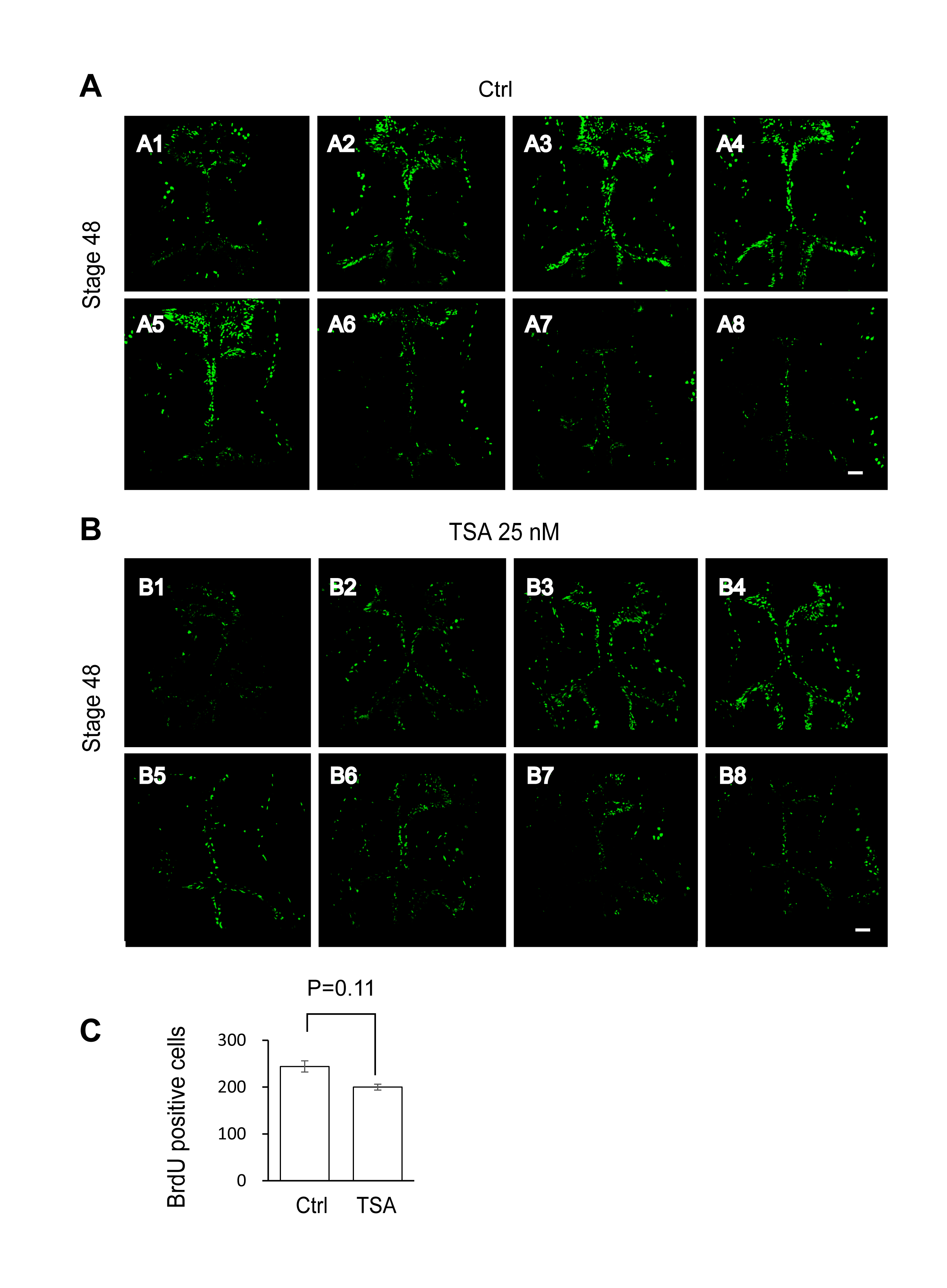 (A, B). Representative staining images showing the BrdU-positive cells in control (A1–A8) and TSA-treated (25 nM, B1–B8) tectum. (C) Quantification data showing that the number of BrdU-positive cells were not significantly changed in TSA-treated tectum compared to the control. p = 0.11, Scale: 50 μm.