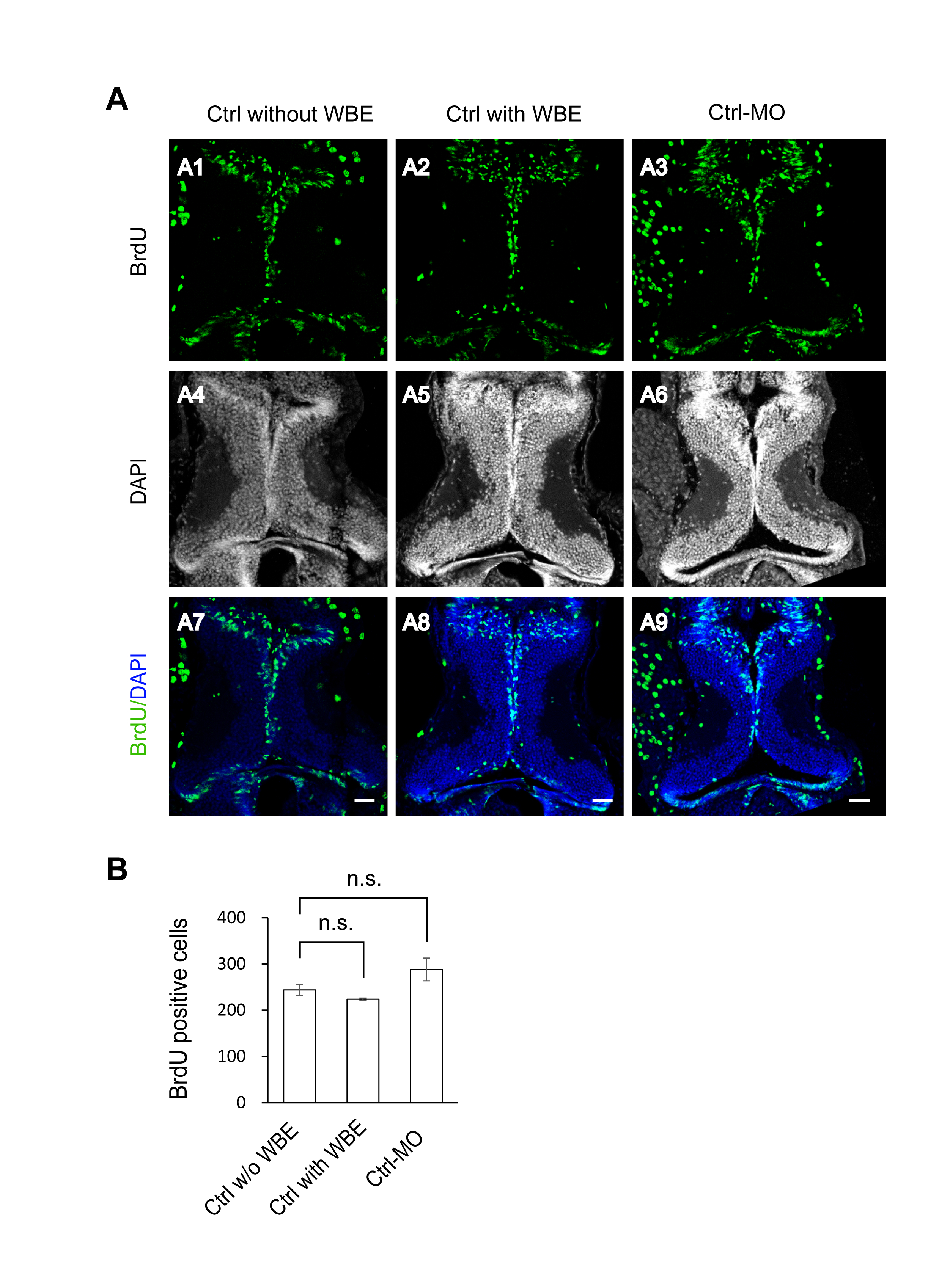 (A). Fluorescent images showing representative BrdU-labeled proliferative cells in a control tectum without whole brain electroporation (WBE) (A1, A4 and A7), with WBE only (A2, A5 and A8) and with Ctrl-MO transfection (A3, A6 and A9). Scale: 50 μm. (B). Quantification data revealed that electroporation only or Ctrl-MO transfection did not change the proliferative rate in stage 48 tadpoles. p>0.05.