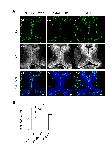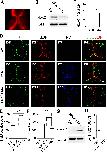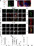 (A). A cartoon showing the tectum at stage 47. The right lobe of the brain was transfected with CMV::eGFP using method of unilateral brain electroporation. The eGFP-expressing cells within the tectum show a characteristic radial glial cell morphology with triangular cell bodies (arrow head), long processes (asterisk) and large end feet (arrow). Scale: 50 μm. (B). The majority of eGFP-expressing cells in the optic tectum are also BLBP-positive. Right panel: a higher magnification image of the right tectum, Scale: 50 μm. (C-D). Xenopus laevis were incubated with BrdU for 2 hours and co-labeled with anti-BrdU and anti-BLBP antibodies at stage 46 (C) and stage 49 (D), respectively. Six representative sections were shown for stage 46 (C1-C6: BrdU staining; C7-C12: BLBP staining and C13-C18: BrdU and BLBP merged) and stage 49 (D1-D6: BrdU staining; D7-D12: BLBP staining and D13-D18: BrdU and BLBP merged), respectively. Arrows indicate the end feet of RGs. Data represent the average cumulative cell counts for 8 sections per brain (Note: remaining figures show one representative section per condition). The shape of the tectal brain was outlined with a dotted line. The counting area was outlined with a white square (C4 and C10). (E). The zoom in images from the square area (C4, C10 and C16) was shown. Arrows indicate cells co-labeled with BrdU (green) and BLBP (red). Scale: 100 μm. (F-G). Quantification of BrdU- and BLBP-positive cells in whole-mount tecta showed decreases in the numbers of BrdU- and BLBP-labeling cells at stage 49 compared to stage 46 (BrdU: St 46, 288.3 ± 24.7, N = 3, St 49, 78.0 ± 7.4, N = 5; BLBP: St 46, 371.3 ± 28.4, N = 3, St 49, 105.2 ± 8.2, N = 5; ***p<0.001). (H). The majority of BrdU-labeling cells are colocalized to BLBP-positive cells at stage 46 and 49 (St 46: 80.6% ± 3.5%, N = 3, St 49: 80% ± 2.3%, N = 5, p = 0.72). |