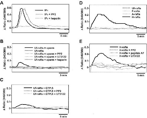 Raft-dependent Ca2+ release in the egg extracts. A,Ca2+ release in CSF extracts was triggered by application of InsPtd(1,4,5)P3 (10 μM) in the absence or presence of PP2 (5 μM) or heparin (100 μM), and monitored by ratio recording of Fura 2 fluorescent signal. B, rafts from unfertilized eggs (Uf-rafts) were preincubated with or without sperm (106/ml) and various inhibitors: PP2 (10 μM), U73122 (10 μM), or heparin (100 μM), and then added to CSF extracts to monitor Ca2+ release as in panel A. C,Ca2+ release was assessed by using GTPγS(1mM) as a raft activator in the absence or presence of PP2 (10 μM) or U73122 (10 μM). D, rafts from various egg samples (Uf-, F-, A-, and H-rafts) were analyzed for their ability to induce Ca2+ release in CSF extracts. E, H-rafts were subjected to Ca2+ release assay in the absence or presence of PP2 (10 μM), peptide A7 (15 μM), or U73122 (10 μM). Shown are representative traces of the fluorescent ratio signal of Fura 2 as a function of time. |