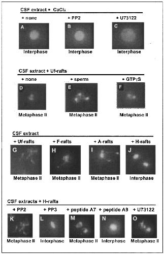 Raft-dependent morphological change of added sperm nuclei in CSF extracts. Cell cycle transition in CSF extracts was determined by morphological changes of added sperm nuclei. A--C, CSF extracts were treated with CaCl2 (1 mM) in the absence (A) or presence of PP2 (B, 10 μM) or U73122 (C, 15 μM) for 40 min. DâF, CSF extracts were treated with Uf-rafts in the absence (D)or presence of sperm (E, 106/ml) or GTPγS (F, 1 mM). GâJ, CSF extracts were incubated with rafts from different egg samples: unfertilized (G), fertilized (H), A23187-activated eggs (I), and H2O2-treated eggs (J). KâO, CSF extracts were treated with H-rafts in the presence of the inhibitors indicated. Morphologies of demembranated sperm nuclei were determined by staining with Hoechst 33342 followed by observation with fluorescent microscopy. Rounded or swollen sperm nuclei undergo a successful transition (indicated as interphase), whereas condensed or scattered sperm nuclei do not (indicated as Metaphase II). |