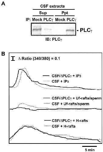 Requirement of PLCγ for raft-dependent Ca2+ release. A, CSF extracts (500 μg of protein) were depleted of endogenous PLCγ by immunoprecipitation (IP) with anti-PLCγ antibody (1 μg of IgG); or mock depleted by immunoprecipitation with control mouse IgG (1 μg of protein) (Mock), as described under âExperimental Procedures.â Proteins in the depleted extracts (Sup) and the immune complexes (Ppt) were separated by SDS-PAGE and analyzed by immunoblotting with anti-PLCγ antibody. B, CSF extracts depleted of PLCγ (CSF/δPLCγ) were subjected to Ca2+ release assay in the absence or presence of InsPtd(1,4,5)P3 (10 μM), Uf-rafts plus either sperm or H-rafts. Control data with the use of intact CSF extracts (gray lines) were also shown. |