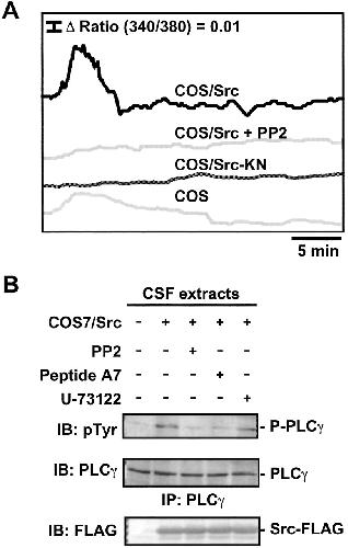 Src-dependent Ca2+ release by rafts prepared from COS7 cells. A, rafts prepared from COS7 cells expressing either FLAG-tagged wild type (COS/Src) or kinase-negative (COS/Src-KN) Xenopus Src or vector alone (COS) were subjected to Ca2+ release assay in CSF extracts. Shown are representative traces of the Fura 2 fluorescent ratio signal as a function of time. Effect of PP2 (10 μM) on wild type Src was also examined (COS/Src + PP2). B, mixtures of CSF extracts and COS7 cell rafts were subjected to in vitro kinase assay in the absence or presence of inhibitors as indicated (each at 10 μM). The reaction mixtures were immunoprecipitated with anti-PLCγ antibody and the immunoprecipitates were analyzed for tyrosine phosphorylation of PLCγ. Expression of FLAG-tagged Xenopus Src (Src-FLAG) was also analyzed by immunoblotting the kinase reaction mixtures with anti-FLAG antibody (1 μg/ml IgG). |