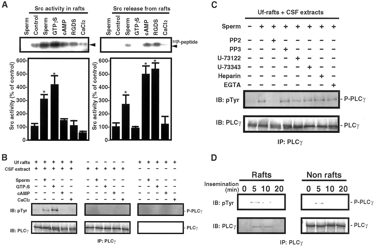 Activation and translocation of Src and phospholipase Cγ. A, left panels, rafts (0.5 μg of protein that corresponds to about 5â10 eggs, 10 μl) from unfertilized eggs were preincubated for 10 min with sperm (106/ml), GTPγS(1mM), cAMP (1 mM), RGDS (1 mM), or CaCl2 (1 mM), and then subjected to in vitro kinase assay with Cdc2 peptide as an exogenous substrate. Right panels, rafts preincubated as in the left panel were diluted and ultracentrifuged. The resulting supernatants were immunoprecipitated with anti-Src antibody, and the immunoprecipitated Src activity was assessed by in vitro kinase assay. Upper panels show representative images for phosphorylated Cdc2 peptide (32P-peptide, indicated by arrowheads). Bars in the lower graphs show mean ± S.D. of three independent experiments. Bars with an asterisk indicate that the data are significantly different from control (p < 0.01). In both experiments, sperm alone did not show any peptide phosphorylation activity. B, rafts from unfertilized eggs (Uf-rafts, 0.5 μg of protein) and/or CSF extracts (500 μg of protein that corresponds to about 4â8 eggs) were preincubated with activators as in panel A and then subjected to in vitro kinase assay. The reaction mixtures were treated with EDTA and SDS, diluted, and subjected to immunoprecipitation (IP) with anti-PLCγ. The immunoprecipitates were analyzed by immunoblotting (IB) with either anti-phosphotyrosine antibody (Tyr(P), PY99 IgG at 0.2 μg/ml), or anti-PLCγ antibody (1 μg/ml IgG). The positions of tyrosine-phosphorylated PLCγ (P-PLCγ) and total PLCγ are indicated. C, mixtures of unfertilized egg rafts (0.5 μg of protein) and CSF extracts (50 μg of protein) were preincubated with sperm (106/ml), and then subjected to in vitro kinase assay in the presence of various compounds: PP2 (10 μM), PP3 (10 μM), U73122 (10 μM), U73343 (10 μM), heparin (100 μM), and EGTA (5 mM). Tyrosine phosphorylation of PLCγ was analyzed as in panel B. D, rafts (50 μg of protein) and non-raft fractions (500 μg of protein) were prepared from Xenopus eggs at different time points after insemination. The extent of tyrosine phosphorylation and total amount of PLCγ in each fraction were assessed by immunoprecipitation and immunoblotting as in panel B. |