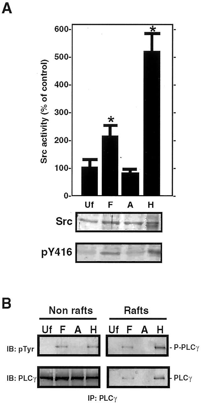 Up-regulation of raft-associated Src and tyrosine phosphorylation of PLCγ in activated Xenopus eggs. A, rafts (0.5 μg of protein) from unfertilized (Uf), fertilized (F, 107/ml sperm, 5 min), A23187-activated (A, 0.5 μM, 5 min), or H2O2-activated eggs (H, 10 mM, 5 min) were subjected to in vitro kinase assay. 32P incorporation into Cdc2 peptide was quantified by a BAS2000 Bioimaging analyzer. The data represent mean ± S.D. of four independent experiments. *, p < 0.01. The raft preparations were also directly analyzed by immunoblotting with either anti-Src antibody (Src) or anti-Tyr(P) 416 antibody (pY416). B, rafts (5 μg of protein) and non-rafts (500 μg of protein) prepared from egg samples were analyzed for tyrosine phosphorylation of PLCγ as in Fig. 1D. |