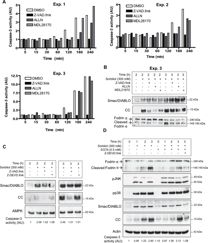 Fig 2. Inhibition of calpains reduces cytochrome c release and caspase-3 activation.A. Calpain inhibitors delay osmostres-induced apoptosis. Oocytes were pre-incubated with calpain inhibitors ALLN or MDL28170, the broad caspase inhibitor Z-VAD.fmk (all at 100 μM), or DMSO (control) for 1 h and treated with 300 mM sorbitol in the presence of inhibitors or DMSO. Caspase-3 activity was determined at different times giving value 1 to non treated oocytes. Data presented from three independent experiments. B. Regulation of cytochrome c release by calpain inhibitors. Smac/DIABLO, cytochrome c (CC), fodrin α, and cleaved fodrin α were determined by Western blot in oocytes treated with 300 mM sorbitol for 2 and 3 h (experiment 3) in the presence or absence of inhibitors. C. Z-VAD.fmk reduces cytochrome c release independently of caspase-3. Oocytes were treated with 300 mM sorbitol for 2 and 3 h in the presence of Z-VAD.fmk (100 μM), caspase-3 inhibitor Z-DEVD.fmk (50 μM), or DMSO (control) and analyzed by Western blot to measure Smac/DIABLO, cytochrome c (CC), and AMPK (loading control). Caspase-3 activity values are indicated below the blots. The result presented is representative of three independent experiments. D. EGTA delays cytochrome c release induced by osmostress. Oocytes were injected with EGTA (0.5 mM final concentration) or with H20 (control) and treated with 300 mM sorbitol for 3 h in the presence or absence of Z-DEVD.fmk (50 μM). Fodrin α, cleaved fodrin α, pJNK, pp38, Smac/DIABLO, cytochrome c (CC), and actin (loading control) were determined by Western blot. Caspase-3 activity is indicated below the blots. The Western blot is representative of three independent experiments. |