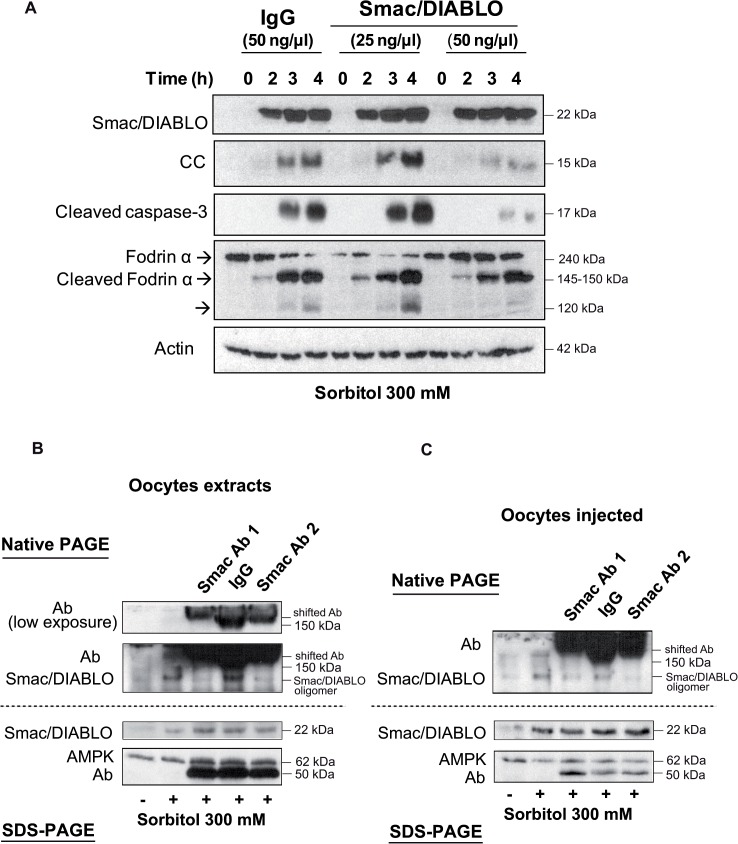 Fig 3. Blockage of Smac/DIABLO with antibodies inhibits cytochrome c release and caspase-3 activation.A. Smac/DIABLO antibodies reduce osmostress induced apoptosis. Oocytes were injected with anti-Smac/DIABLO (25 or 50 ng/μl final concentration) or with anti-human IgG (50 ng/μl) as a control, and treated with 300 mM sorbitol. Cytosolic extracts were obtained at different times to measure Smac/DIABLO, cytochrome c (CC), cleaved caspase-3, fodrin α, cleaved fodrin α, and actin (loading control) by Western blot. The result is representative of three independent experiments. B. Smac/DIABLO antibodies interact with Smac/DIABLO in cytosolic fractions. Oocytes were treated with 300 mM sorbitol and cytosolic extracts were obtained at 3 h and incubated with anti-Smac/DIABLO from ProSci (Ab1), anti-Smac/DIABLO from Calbiochem (Ab2), or rabbit IgG from Sigma as a control antibody. 100 μl of cytosolic extract were incubated with 5 μl of the corresponding antibody (1μg/μl) for 2 h at 4°C on a rotating wheel before their analysis by native-PAGE or SDS-PAGE and Western blot to measure the levels of Smac/DIABLO, AMPK, and the antibodies. C. Smac/DIABLO antibodies interact in vivo with Smac/DIABLO. Oocytes were injected with Ab1, Ab2, or rabbit IgG (50 ng/μl final concentration), and treated with 300 mM sorbitol for 3 h. Cytosolic extracts were analyzed by native-PAGE or SDS-PAGE and Western blot to measure the levels of Smac/DIABLO, AMPK, and the antibodies. |