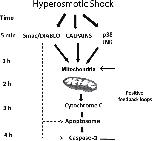Fig 6. Osmostress-induced apoptosis in Xenopus oocytes.Four independent pathways are activated by hyperosmotic shock: JNK, p38, calpains, and Smac/DIABLO. Sustained activation of stress protein kinases in combination with Smac/DIABLO and calpains converge on the mitochondria to induce the release of high levels of cytochrome c into the cytosol, which in turn activates caspase-3 engaging several positive feedback loops to make the cell death program irreversible. |