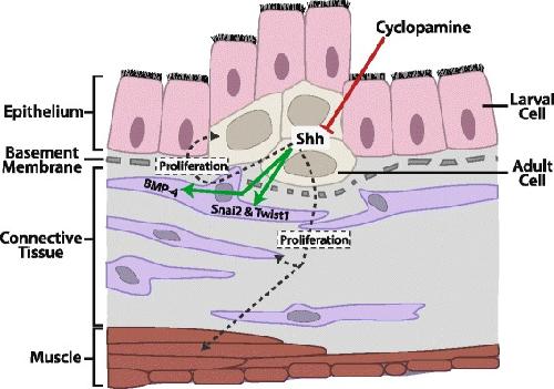 A schematic diagram showing the effects of Shh signaling during intestinal remodeling. Shh appears to enhance the proliferation of cells in all three tissue layers during metamorphosis. Shh receptors and downstream transcription factors are highly expressed in the connective tissue, which are likely responsible for the activation of the expression of BMP-4, Snai2, and Twist1. The connective tissue may in turn help to mediate the cell proliferation effects of Shh on the adult epithelial stem cells and the circular muscle cells. Cyclopamine directly inhibits Shh signaling in the epithelium and thus blocks all the effects of Shh.