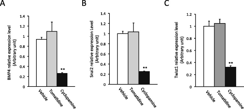 Cyclopamine inhibits Shh target gene expression. Tadpoles at stage 58 were treated as in Figure 2 until they reached stage 62. Total intestinal RNA was isolated for qRT-PCR analysis of the expression of Shh target genes BMP4 [51] (A), Snai2 [52] (B) and Twist1 [52] (C). ** indicate significant difference between the cyclopamine group and the other groups (p < 0.001).