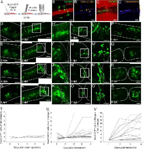 Fig. 5. In vivo time-lapse imaging of Sox2/3+ cells in response to spinal cord injury. (A) Schematic representation of in vivo electroporation and imaging by 2 Photon Microscopy of pSox3: GFP in the spinal cord of stage 50 tadpoles. Double immunofluorescence in sagittal sections of the spinal cord for (B) GFP (green), Sox2 immunolabeling (red), (C) CldU (red). Co-localization analysis is shown in (Bâ² and Câ²) in a pseudo-color scale. (DâS) Z-stacks of in vivo 2 photon microscope images of GFP-expressing cells after electroporation, show a control sham animal at (D) 1 day after electroporation (dpe), (E) 2 dps, (F) 4 dps, (G) 6 dps. After SCI, the increase in total number of GFP+ cells is shown in (H) at 2 dpe, (I) 2 dpt, (J) 3 dpt, (K) 4 dpt, (Hâ²âKâ²) magnifications of (HâK). (LâS) Migration of GFP+ cells to the gap injury site is shown in (L) at 1 dpe, (M) 1 dpt, (N) 3 dpt, (O) 7 dpt, magnifications of (LâO) in (Lâ²âOâ²), and no migration in (P) at 1 dpe, (Q) 1 dpt, (R) 3 dpt, (S) 8 dpt. Fold change of Sox3-GFP+ cells in sham control animals (T), after injury (U) and migration to the gap injury (V). Scale bar in (BâCâ²; DâG; HâK; LâO; PâS) 100 µm, (Hâ²âKâ²; Lâ²âOâ²) 50 µm. (For interpretation of the references to color in this figure legend, the reader is referred to the web version of this article.) |