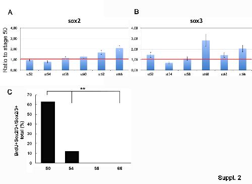 Fig. S2: Sox2/ Sox3 expression during metamorphosis. (A and B) Dynamic expression of Sox2 and Sox3 for RT-qPCR during metamorphosis. (C) Quantification of Sox2/3+/BrdU+ cells present in the spinal cord at different stages of metamorphosis (see Fig. 3 A and I). ⁎P<0.05, ⁎⁎P<0.01, and ⁎⁎⁎P<0.001. |