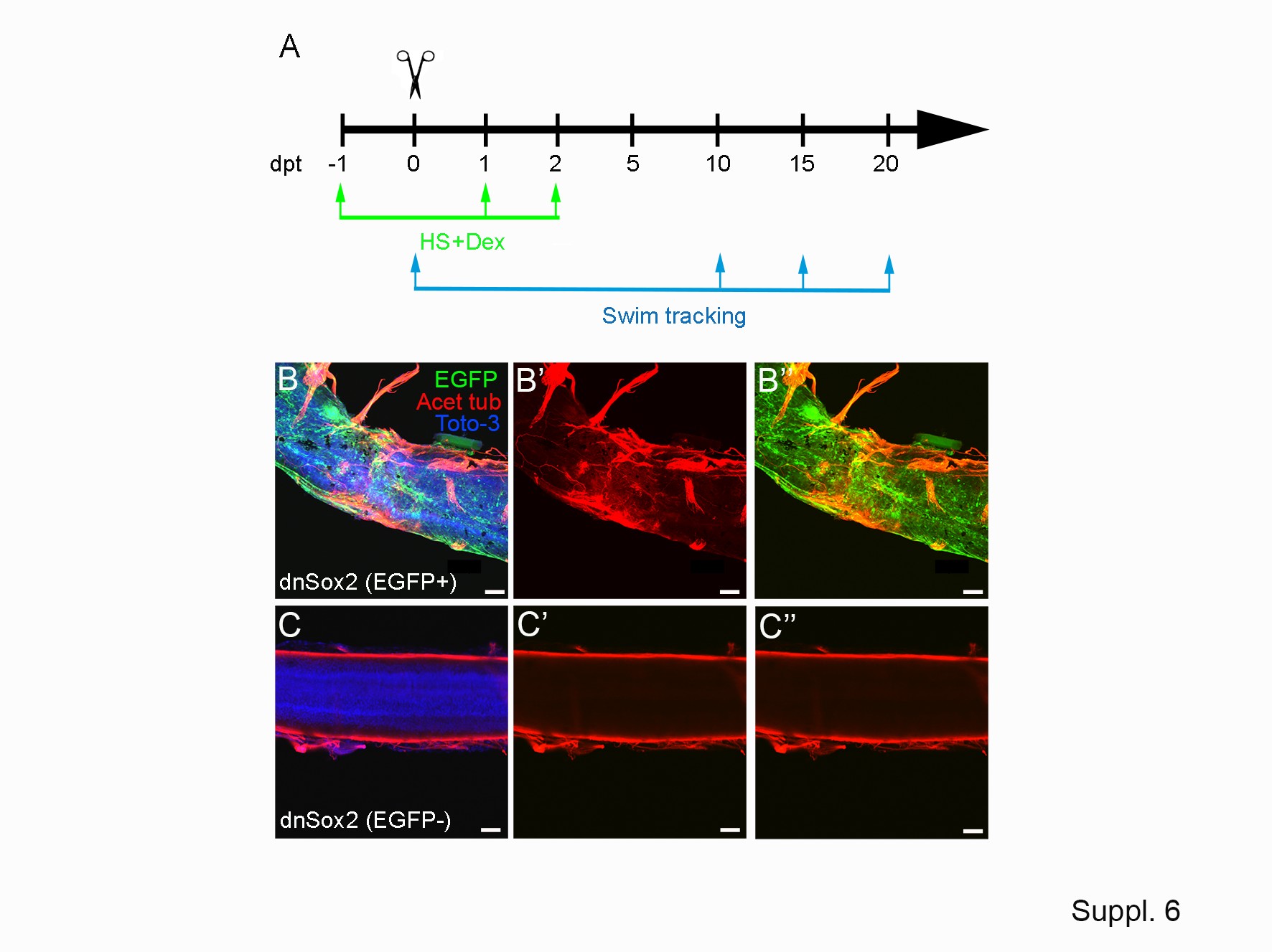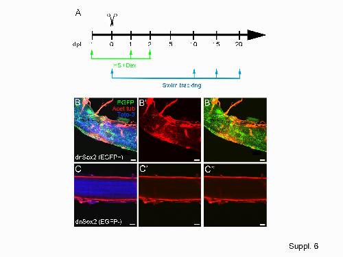 Fig. S6: Effect of dnSox2 in spinal cord regeneration. (A) Schematic representation of the protocol used for the heat shock and transection in stage 50 tadpoles. (B–C) dnSox2 F1 tadpoles were analyzed at stage 50 by immunofluorescence in flat mounts at 15 dpt. dnSox2 (EGFP+, B–B″) and dnSox2 (EGFP-, C–C″). EGFP (green), acetylated tubulin (red) and nuclei (blue). Scale bar in (B–C″) 100 µm. |
