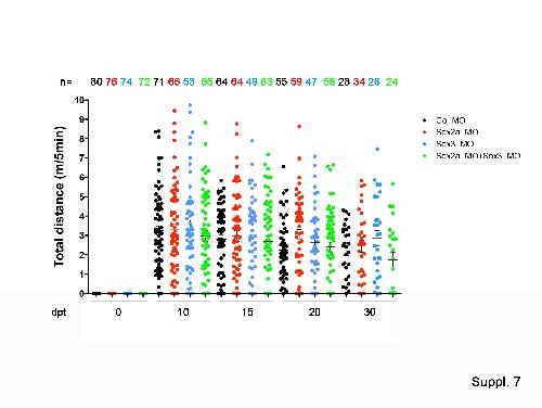 Fig. S7: Effect of Sox3_MO in spinal cord regeneration. Graph of the total distance swam by tadpoles electroporated with Co_MO (black circles), Sox2a_MO (red circles), Sox3_MO (blue circles) and Sox2a_MO+Sox3_MO (green circles). m/5 min: meters in 5 min. |