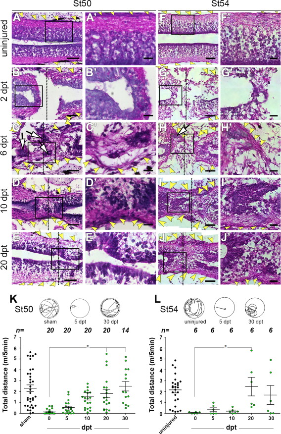 Fig. 2. Characterization of non-regenerative stages of Xenopus laevis. Hematoxylin and eosin staining of longitudinal sections of spinal cords from uninjured animals and at 2, 6, 10 and 20 dpt in pro-metamorphic stage 56 (AâE) and post-metamorphic stage 66 (FâJ) respectively. Black boxes indicate magnifications for stage 56 (Aâ²âEâ²) and 66 (Fâ²âJâ²). Samples of swim trajectories (top, single representative animals for each step) and graphs of the total time animals spent swimming in 5 min at stage 56 (K) and stage 66 (L) in sham-operated animals and in animals with spinal cord transection at 0, 5, 10, 20 and 30 dpt. Dotted line: injury site or ablation gap, yellow arrowheads: meningeal layer, arrow: cell clusters, vz: ventricular zone, svz: sub-ventricular zone. Scale bar (AâE) 100 µm; (FâJ) 200 µm; (Aâ²âJâ²) 30 µm. (For interpretation of the references to color in this figure legend, the reader is referred to the web version of this article.) |