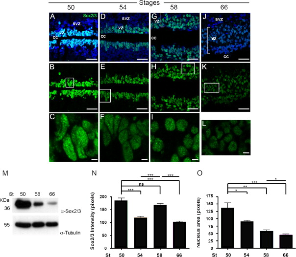 Fig. 3. Analysis of Sox2/3 expression in the spinal cord in non-regenerative and regenerative stages. (A–L) Longitudinal cryosections through the spinal cord of animals at stage 50 (A–C), 54 (D–F), 58 (G–I) and 66 (J–L), analyzed by immunostaining for Sox2/3 (green) and staining for TOTO3 (nuclei, blue). A, D, G and J. Double labeling for Sox2/3 and TOTO3. B,E,H and K. Sox2/3 only. (C, F, I and L) Higher magnification images of regions shown in white boxes in B, E, H, K. (M) Western blot showing immunolabeling for Sox2/3 in tadpoles (stage 50–58) and froglets (stage 66). α-tubulin immunolabeling is shown as a loading control. (N) Analysis of the signal intensity of Sox2/3 immunolabeling in of B,E,H and K. (O) Analysis of the area of the nuclei of C,F,I and L. cc: central channel, vz: ventricular zone and svz: sub-ventricular zone. Scale bars (A, B, D, E, G, H, J and K) 20 µm; (C, F, I and L) 2 µm. *P <0.05, **P<0.01, and ***P<0.001. (For interpretation of the references to color in this figure legend, the reader is referred to the web version of this article.) |