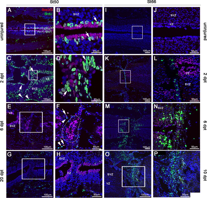 Fig. 4. Proliferation of Sox2/3+ cells in response to spinal cord injury. (AâP) Immunolabeling for BrdU and Sox2/3 in stage 50 or 66 animals at designated times after spinal cord transection show dramatic increases in proliferation in regenerative stages but not non-regenerative stages. Spinal cords were transected and animals were treated for 16 h with BrdU and fixed at 2, 6 or 10 dpt. Horizontal sections through the spinal cord were analyzed by double immunofluorescence BrdU (green) and Sox2/3 (red) from uninjured animals and at 2, 6 and 20 dpt in tadpoles stage 50 (AâH) and uninjured, 2, 6 and 10 dpt in froglets stage 66 (IâP). (B, D, F, H, J, L, N and P) Higher magnifications of regions shown in black boxes for A, C, E, G, I, K, M and O. Arrow and arrowheads in C, D and F: BrdU+Sox2/3+ cells and BrdU+ Sox2/3- respectively. vz: ventricular zone and svz: sub-ventricular zone. Nuclei: TOTO3 (blue). Scale bars are as indicated. (For interpretation of the references to color in this figure legend, the reader is referred to the web version of this article.) |