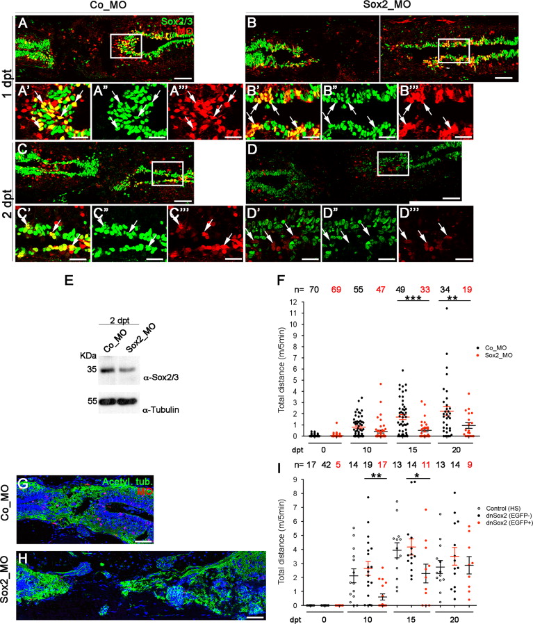 Fig. 6. Sox2 is required for functional recovery after spinal cord injury. (AâDâ²â²) Tadpoles at stage 50 were electroporated with control lissamine-tagged morpholino (Co_MO, red) and Sox2 lissamine-tagged morpholino (Sox2_MO, red), transected, and analyzed by immunofluorescence against Sox2/3 (green) in longitudinal sections at 1 (AâBâ²â²) and 2 (CâDâ²â²) dpt. (Aâ², Aâ², Aâ²â²), (Bâ², Bâ², Bâ²â²), (Câ², Câ², Câ²â²) and (Dâ², Dâ², Dâ²â²) magnification of insets showed in A, B, C, D respectively. Arrows: co-localization of morpholino with Sox2/3 antibody. (E) Western blot of Sox2/3 in Co_MO and Sox2_MO. (F) Graph of the total distance swam by tadpoles electroporated with Co_MO (black circles) and Sox2_MO (red circles). (GâH) Immunofluorescence of acetylated tubulin in spinal cord longitudinal sections of electroporated Co_MO tadpoles (G) and Sox2_MO (H) after 15 days post electroporation and transection. Morpholino (red) acetylated tubulin (green) and nuclei (blue). Pictures are representative of the results observed in two independent experiments. (I) Graph of the total distance swam by transgenic tadpoles. All animals received a heat shock one day before transection and at 1 and 2 dpt. Red circles: animals that overexpress dnSox2 (EGFP+), black circles transgenic animals that do not overexpress the transgene (EGFPâ) and empty circles correspond to control animals. m/5 min: meters in 5 min. Scale bar in (AâD) 100 µm, (Aâ²âAâ²; BââBâ²; Câ²âCâ²; Dâ²âDâ²; GâH) 20 µm. *P<0.05, **P<0.01, and ***P<0.001. (For interpretation of the references to color in this figure legend, the reader is referred to the web version of this article.) |