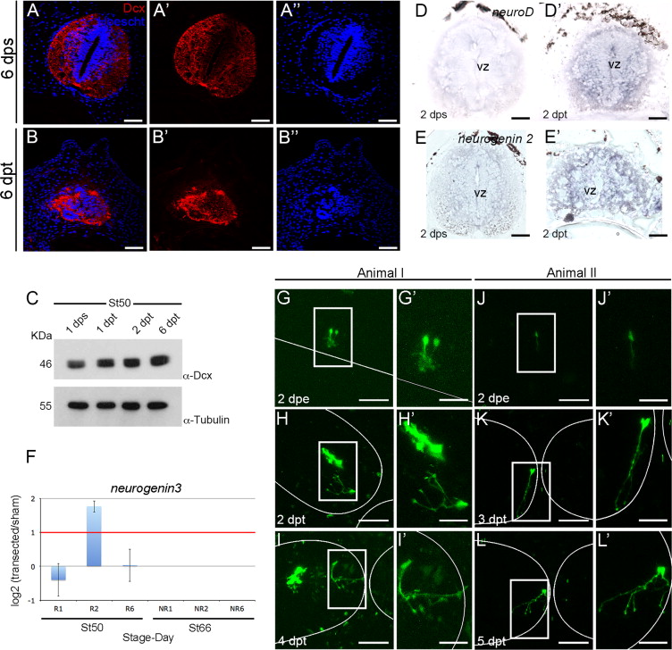 Fig. 7. SCI induces neurogenesis in regenerative stage animals. (AâBâ²) Immunofluorescence of the Doublecortin (Dcx, red) in spinal cord transversal cryosections at stage 50 in sham (A, Aâ²) and 2 dpt (B, Bâ²) animals. Nuclei: Hoescht (blue). (C) Western blot of Dcx in sham and 1, 2, 6 dpt tadpoles (upper panel) and Tubulin (bottom panel) as loading control. (DâEâ²) In situ hybridization of neuroD and neurogenin2 in 2 dps (D, E) and 2 dpt (Dâ²âEâ²) tadpoles. (F) Dynamic expression of neurogenin3 for RT-qPCR in tadpoles (R) and froglets (NR) in 1, 2 and 6 dpt. (GâLâ²) Z-stack of in vivo imaging of Sox3: GFP electroporated cells after spinal injury showing early differentiation to neuronal morphology in: animal I at (G) 2 dpe, (H) 2 dpt and (I) 4 dpt, and animal II at (J) 2 dpe, (K) 3 dpt and (L) 5 dpt. Magnifications of (GâI) and (JâL) are show in (Gâ²âIâ²) and (Jâ²âLâ²) respectively. vz: ventricular zone. Scale bar in (AâBâ²) 20 µm (GâL) 100 µm, (Gâ²âLâ²) 50 µm. (For interpretation of the references to color in this figure legend, the reader is referred to the web version of this article.) |