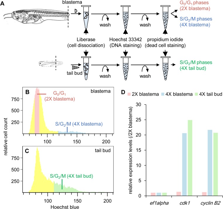 Fig 2. Isolation of proliferating and non-proliferating tail blastema cells and proliferating tail bud cells using flow cytometry.(A) A schematic drawing of the cell preparation procedure. Xenopus images were obtained from [18] and modified. (B,C) Cell cycle analysis of cells in (B) tail blastemas and (C) tail buds using flow cytometry. Horizontal axes represent relative fluorescent intensity of Hoechst blue, which reflects DNA contents, and vertical axes represent relative cell counts. The cells were classified into G0/G1 phases (major peaks), and S/G2/M phases (whose DNA contents were higher than those of cells in the major peak and lower than twice of those of cells in the major peak) based on the DNA content. Cell fractions colored in red (‘2X-tail blastema’ cell fraction), blue (‘4X-tail blastema’ cell fraction), and green (‘4X-tail bud’ cell fraction), respectively, were collected and subjected to RNA-sequence analysis. (D) Comparison of expression levels of cell cycle markers. Relative expression levels were estimated from RNA-sequencing data, taking the values in the ‘2X-tail blastema’ cell fraction as 1. Expression levels of ef1α, a housekeeping gene, were almost the same in all samples.