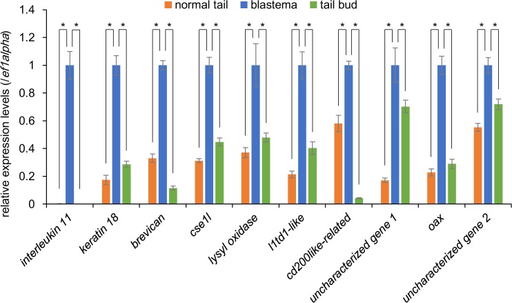 Fig 4. Identification of genes expressed preferentially in the tail blastema by qRT-PCR.The relative expression levels of the 10 genes which show the blastema-selective expression by qRT-PCR using RNAs extracted from normal tails (orange), regenerating tails (blue), and tail buds (green). The vertical axis represents relative expression levels calculated by taking the value of blastemas as 1, following normalization using those of ef1α. (mean ± SE, n = 4) *P < 0.05, Dunnettâs test. Abbreviations: cse1l, chromosome segregation 1-like; l1td1, LINE-1 type transposase domain-containing protein 1; oax, oocyte activation in Xenopus.