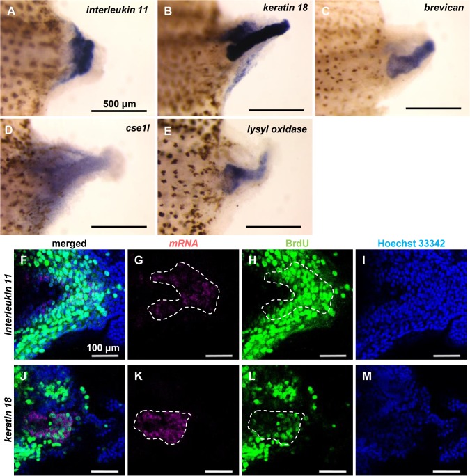 Fig 5. Expression analysis of candidate genes in regenerating tadpole tails by whole mount in situ hybridization.(A-E) Whole mount in situ hybridization using 3-dpa regenerating tails of St. 49-53 tadpoles for (A) interleukin 11, (B) keratin 18, (C) brevican, (D) cse1l, and (E) lysyl oxidase (blue/purple). (F-M) Sagittal sections of tailblastema from 3-dpa regenerating tails of St. 49-53 tadpoles double stained by whole mount in situ hybridization for (F-I) interleukin 11 and (J-M) keratin 18 (magenta) and BrdU-immunohistochemistry (green). (G) and (K) show magenta channels (mRNA), (H) and (L) show green channels (BrdU), (I) and (M) show blue channels (nuclei stained with Hoechst 33342), and (F) and (J) show merged images. Note that mRNA signals detected in the cytoplasm do not exactly merge with BrdU-signals detected in the nuclei. White broken lines indicate cell populations that highly expressed the genes. Anterior is to the left, and dorsal is up. Scale bars indicate 500 μm in (A-E) and 100 μm in (F-M).