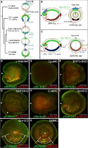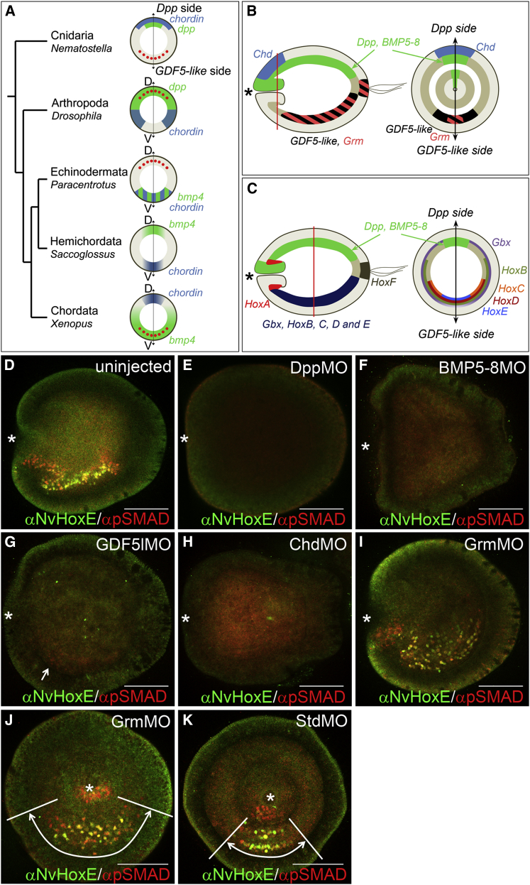 Figure 1. BMP Signaling Is Strongest on GDF5-like-Expressing Side of Nematostella Embryo(A) Positions of chordin (blue) expression, bmp4 (green) expression, and BMP signaling domain (red circles) in different animal models.(B and C) Schematic representation of NvDpp, NvBMP5-8, NvGDF5-like, NvChd, NvGrm, NvGbx, and Hox expression domains in planula viewed laterally and orally. Red lines, cutting planes; black double-headed arrows, directive axis; asterisks, blastopore.(D–K) The αpSMAD1/5 and αNvHoxE antibody staining in control and morphant early planulae, n > 50 for each sample; (D–I) lateral views; (J and K) oral views; asterisks, blastopore. (D) αpSMAD1/5-positive nuclei are located on NvHoxE-expressing side. αpSMAD1/5 and αNvHoxE stainings partially overlap. (E–K) αpSMAD1/5 and αNvHoxE in StdMO, ChdMO, GrmMO, GDF5lMO, BMP5-8MO, and DppMO embryos. Staining is absent in DppMO, BMP5-8MO, and ChdMO and suppressed (white arrow) in GDF5lMO (E–H); the domain showing strong staining (white double-headed arrows and white demarcating lines) is narrower in the StdMO than in the GrmMO (J and K).See also Figure S1.