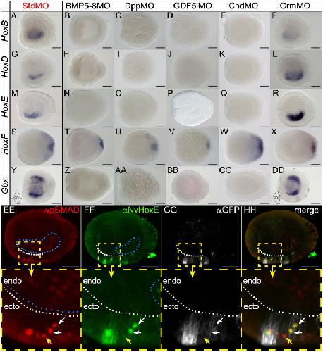 Figure 3. Staggered Endodermal Expression of Hox Genes and NvGbx Is Regulated by BMP Signaling(A–DD) Expression of NvHoxB (A–F), NvHoxD (G–L), NvHoxE (M–R), NvHoxF (S–X), and NvGrm (Y–DD) in StdMO-, BMP5-8MO-, DppMO-, GDF5lMO-, ChdMO-, and GrmMO-injected embryos at early planula stage. Lateral views; oral end to the left. Embryos on (Y) and (DD) are rotated 90° compared to other stained embryos to make bilateral expression of NvGbx visible.(EE–HH) Ectopic expression of BMPRIQ209 > D-EGFP in patches of ectodermal cells in 2-day planula results in ectopic activation of NvHoxE protein. (EE) Ectopic pSMAD1/5-positive nuclei in the ectoderm of early planula in addition to endogenous staining in the endoderm (blue dots). (FF) In addition to endogenous αNvHoxE staining (blue dots), ectopic expression is observed in pSMAD1/5-positive ectodermal nuclei. Apart from specific nuclear NvHoxE signal, the secondary anti-rat antibody cross-reacts with mouse anti-GFP antibody staining the BMPRIQ209 > D-EGFP fusion protein in the cell membranes. (GG) Anti-GFP antibody detects BMPRIQ209 > D-EGFP in cell membranes. Anti-mouse antibody does not cross-react with the rat αNvHoxE, thus no nuclear staining is observed, showing that nuclear staining on (FF) is specific for NvHoxE. (HH) Merged image of (EE–GG). White dots indicate the border between ectoderm and endoderm. White arrows point at two strongly pSMAD1/5-positive ectodermal nuclei in transgenic cells, which also ectopically express NvHoxE. Yellow arrows point at a weakly pSMAD1/5-positive ectodermal nucleus in a transgenic cell, which does not express detectable amounts of NvHoxE. Scale bars represent 50 μm.See also Figure S3.