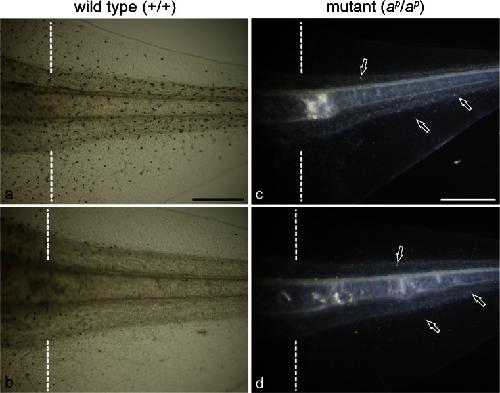 Fig. 1. Expression of pigment cells in the 6-day regenerating tail in the absence (a, c) or presence (b, d) of phenylthiourea (PTU); amputated at stage 50. a, b Wild type regenerating tail observed under transmitted light. c, d Mutant regenerating tail observed under incident light. Dashed lines indicate amputation level. Many melanophores appeared in the wild type regenerating tail in the absence of PTU (a). However, few melanophores appeared in the wild type regenerating tail in the presence of PTU (b). In contrast, white pigment cells (arrows) appeared in the mutant regenerating tail in both the absence (c) and presence (d) of PTU. Barâ500 μm |