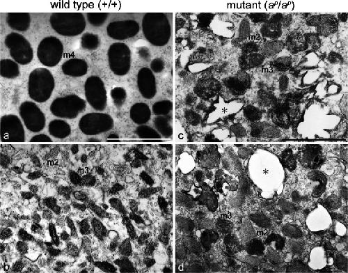 Fig. 3. Ultrastructural characteristics of pigment cells that differentiated in the 18-day regenerating tail in the absence (a, c) or presence (b, d) of PTU (amputated at stage 50). a, b Ultrastructure of melanophores in the wild type regenerating tail. c, d Ultrastructure of white pigment cells in the mutant regenerating tail. Wild type melanophores in the absence of PTU (a) were filled with stage IV melanosomes (m4), whereas melanophores in the presence of PTU (b) contained stage II melanosomes (m2) and stage III melanosomes (m3). White pigment cells in both the absence (c) and presence (d) of PTU contained irregular-shaped reflecting platelets (asterisks), stage II melanosomes (m2), and stage III melanosomes (m3). The quantitative data on pigment organelles in the absence or presence of PTU are presented in Table 1 (wild type) and Table 2 (mutant). Barâ1 μm |