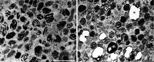 Fig. 4. Ultrastructural comparison between mutant melanophores (a) and white pigment cells (b) in culture. Mutant melanophores in culture contained stage II melanosomes (m2), stage III melanosomes (m3), and few mature melanosomes. Cultured white pigment cells in the mutant contained stage II melanosomes (m2), stage III melanosomes (m3), and irregular-shaped reflecting platelets (asterisk). Few mature melanosomes were present in white pigment cells. Bar 1 μm |